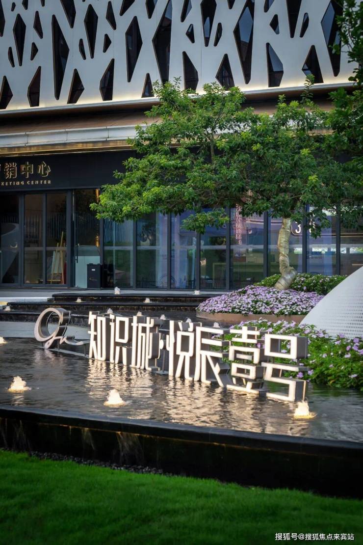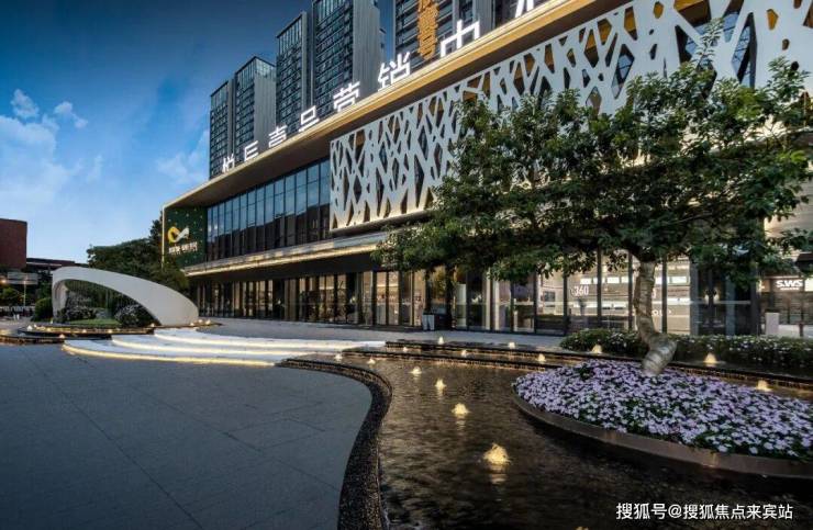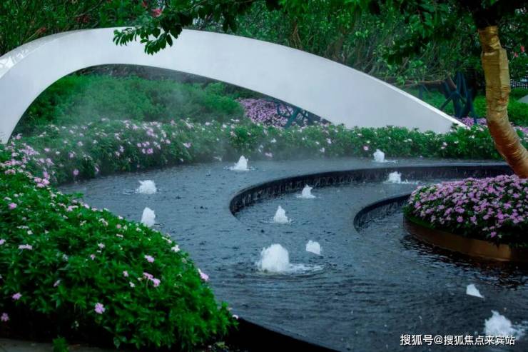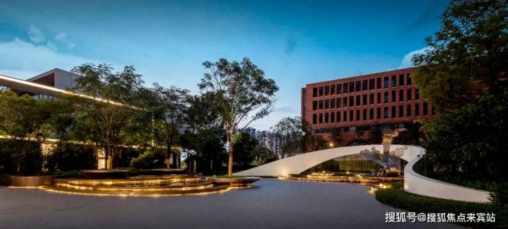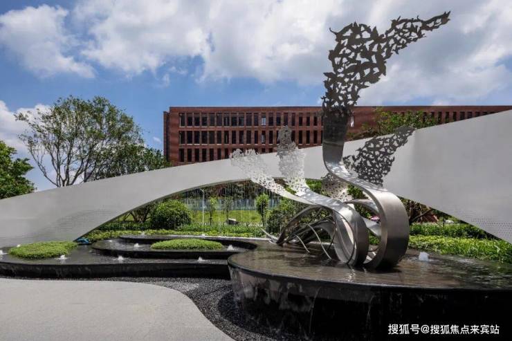 迎宾广场两侧借地势设置特色跌级水景,潺潺流水之声如珠玉落盘,拾级而上,聆听水声,感受惬意的生活体验。