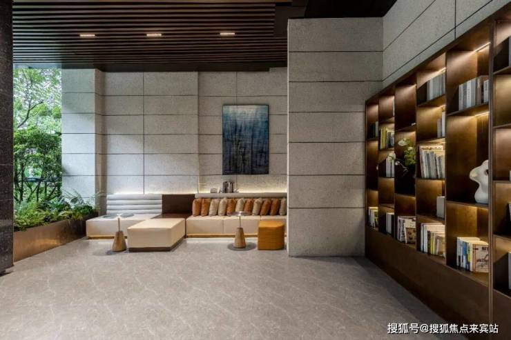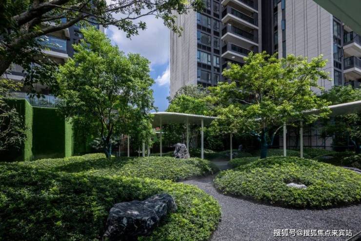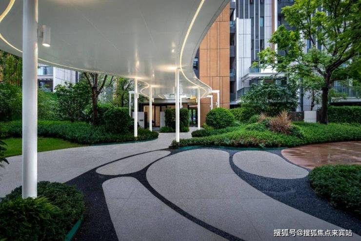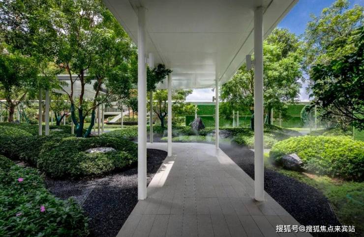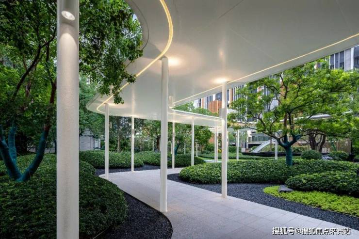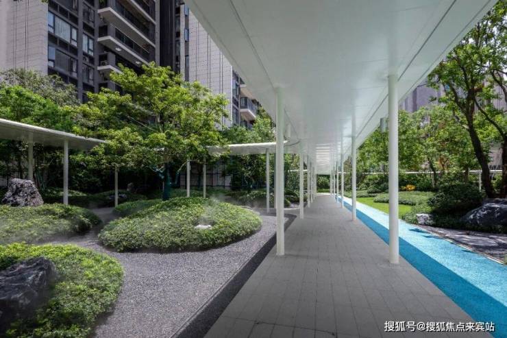 漫步到达生活会客厅空间,视线与中部水景廊架处豁然开朗,并惊叹于“行云流水”场景氛围。