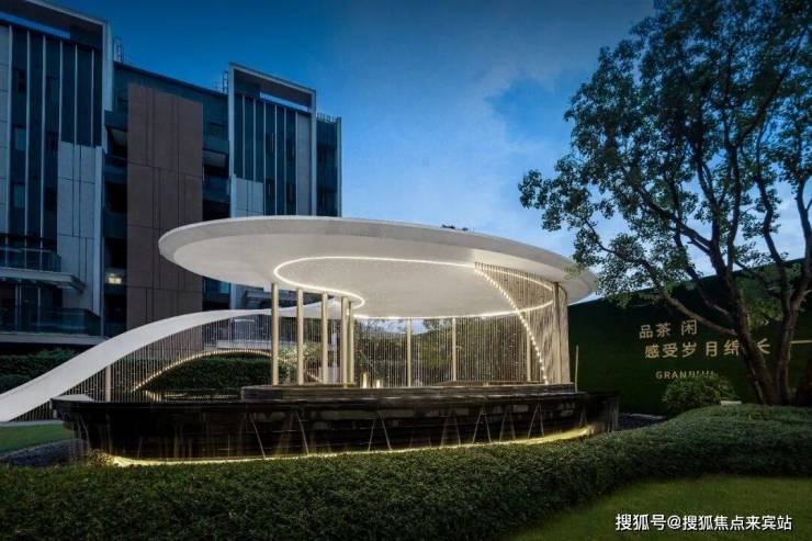 特色水景廊架顶置星空特色香槟金格栅点缀勾勒,灵动优美,营造了一个别具一格的社区文化交流空间。