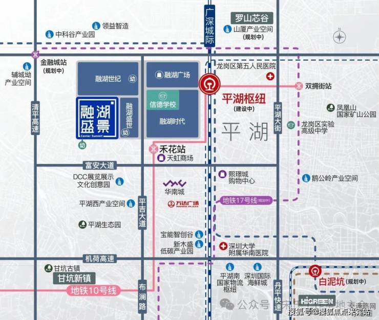 地铁:项目距离10号线禾花站约500米(百度测距),连接坂田,直达福田中心区;另有规划中地铁17号线(直连罗湖口岸)/18号线(连通空港新城),通勤更高效;