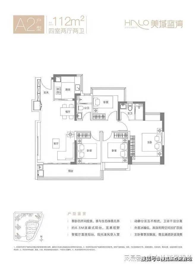 四个卧室面积分别为:主卧18㎡、次卧9.99㎡、次卧8.37㎡(含飘窗),客厅连接次卧,配备6.4米长的大阳台,通风与采光俱佳,U型厨房设计,卫生间干湿分离,得房率约80.11%(不含赠送),朝向西南或东北。