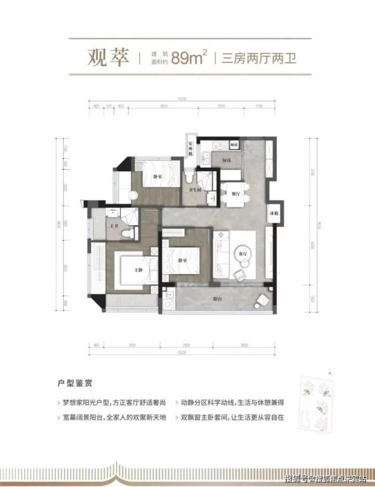 89㎡的3房2厅2卫:竖厅格局,客厅开间3.4米,LDKB一体化,S墙设计预留冰箱卡槽位,3个卧室分别做到了3.9米/2.9米/2.6米的宽度,客厅连接次卧出6.3米长的大阳台,L型厨房,卫生间干湿分离,朝向有西北、西南或东南。