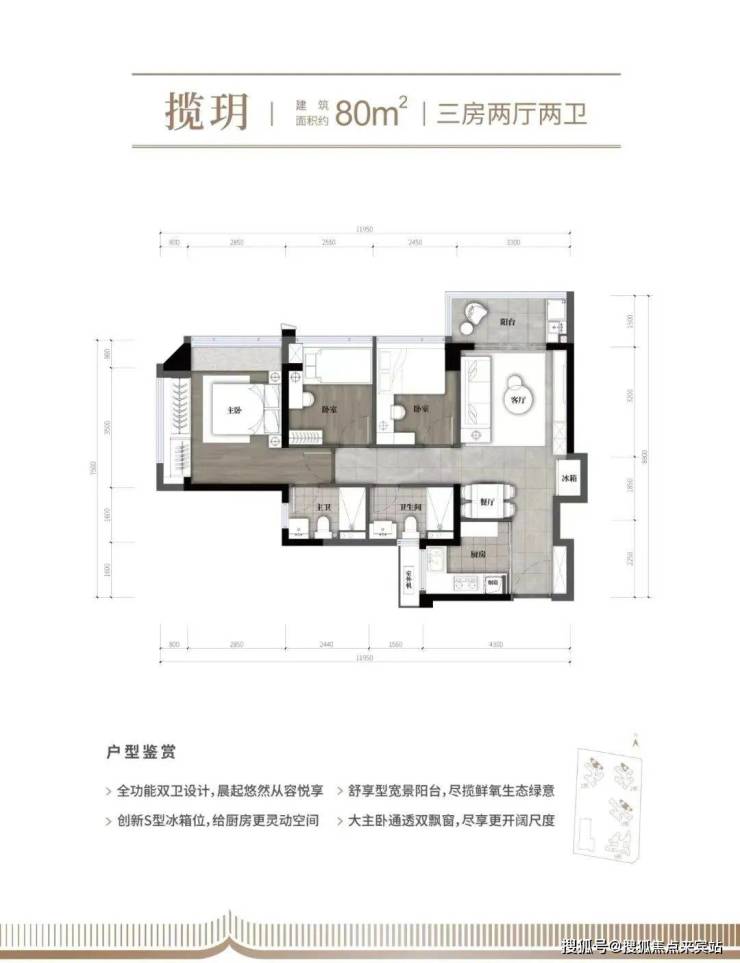 80㎡的3房2厅2卫:竖厅格局,客厅开间3.3米,LDKB一体化,S墙设计预留冰箱卡槽位,3个卧室分别做到了3.65米/2.55米/2.45米的宽度,L型厨房,卫生间干湿分离,朝向有东北向或正东。