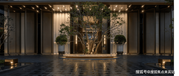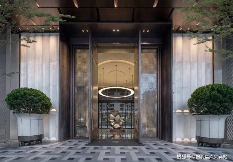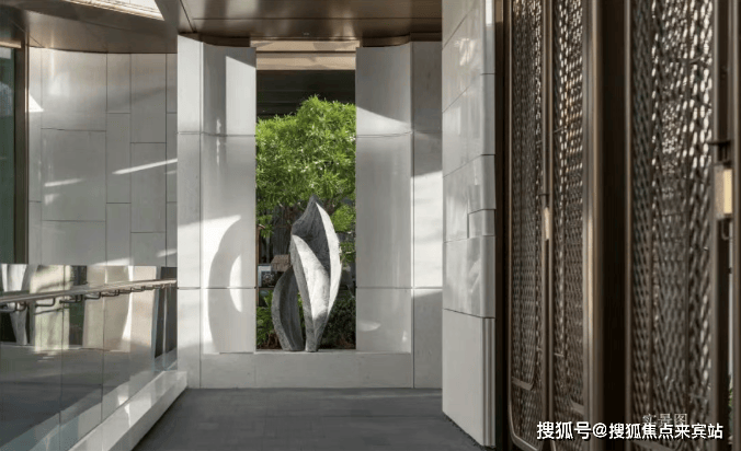踏入三亚保利天珺主庭,玉的仪式感自门庭启幕——约3.6米高海浪灰石门柱顶悬精致玉石,珺字徽章如玺印烙刻山河气度。