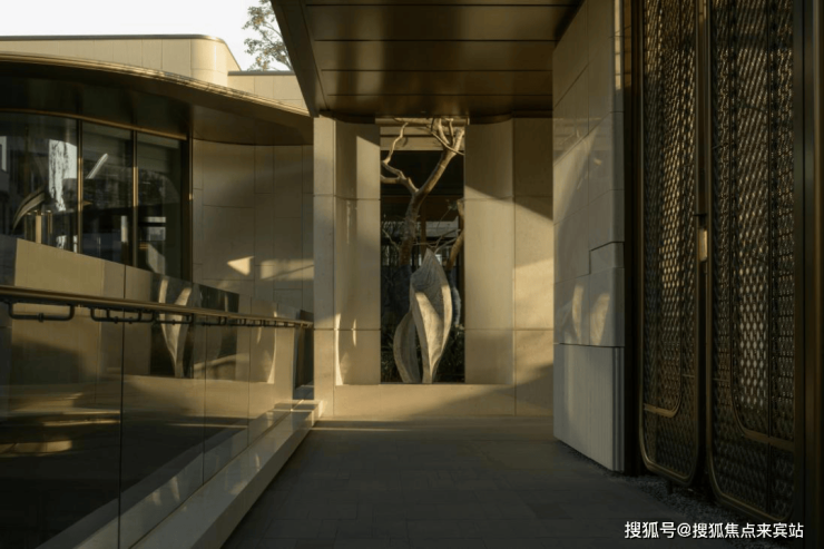 漫步约240米无风雨连廊,玉的意象翩然起舞,35扇方胜纹金属屏风间,8枚约5公分厚皇家白玉玉缀悬坠如星,昼承天光,夜泛清辉,转角矗立《玉韵花沐》雕塑,浪淘沙石质温润似古玉生香,与月光米黄石柱共谱“石不能言最可人”的幽韵。