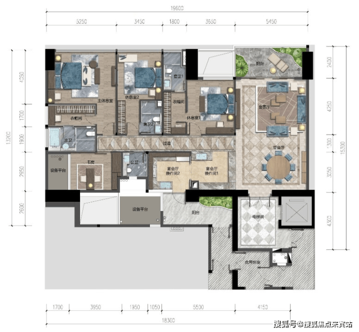其次,步入424㎡样板房,3.7米层高的大平层一扫压抑,270°、长达26米的L型阳台,迎进更多阳光与清风,并且,全屋无梁无柱、无承重墙,意味着一套房子,可以按照自己的喜好,拥有N种设计方案。