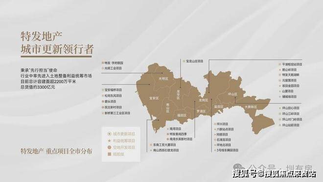 特发地产,成立于1997年7月,是特发集团下属全资国有企业,紧扣“双区驱动”国家战略,深耕深圳、大湾区及长三角等区域,以住宅开发为主,发展成为卓越的城市更新综合开发运营商。在深圳市属国企中率先大举介入城市更新领域,在全行业中较早进入土地整备利益统筹市场,不断创新商业模式,携手众多优秀合作伙伴,锁定大量优质项目,截止2023年5月,共储备各类型项目29个,总计容建筑面积约2200万平方米,总货值约3300亿元,处于行业前沿。