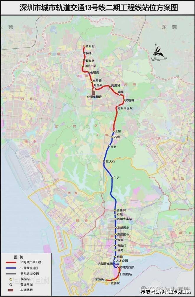 ①13号线及其南、北延长线(建设中,预计2025年开通)起于东角头站,终于公明北站,纵贯光明、宝安、南山,线路开通后约30分钟可抵达南山核心区,约45分钟可达深圳湾口岸,以高新技术人才为主要客流,被称为高新技术人才专线