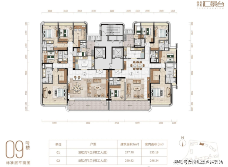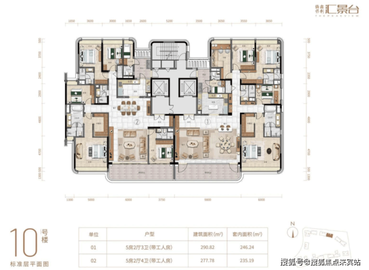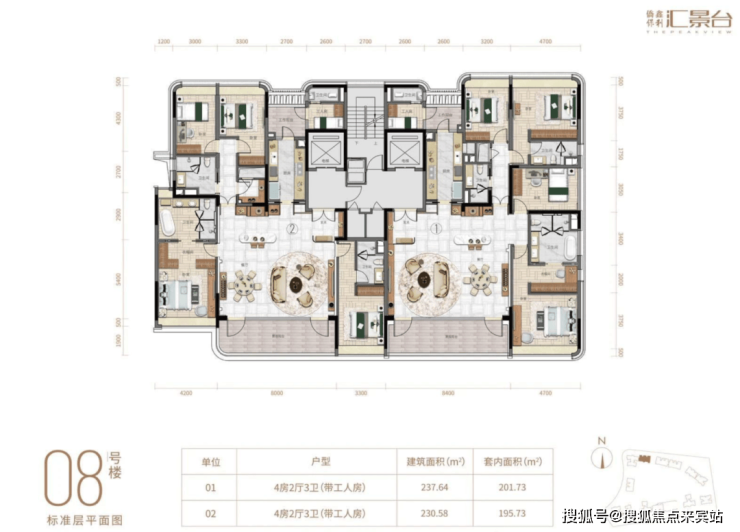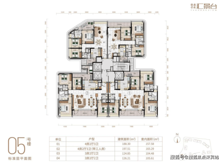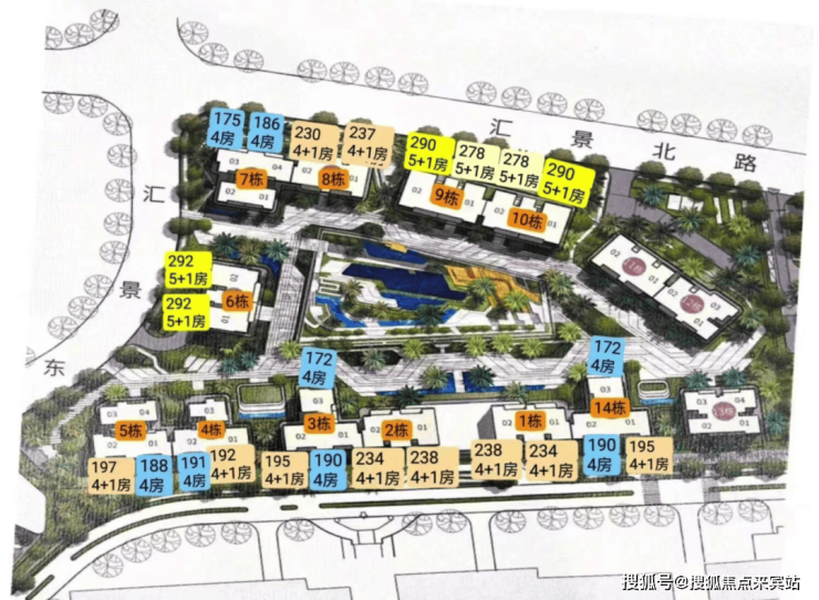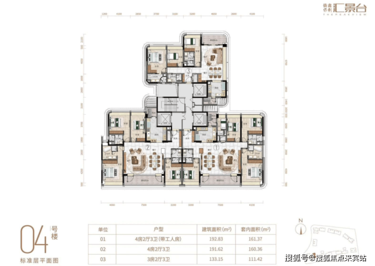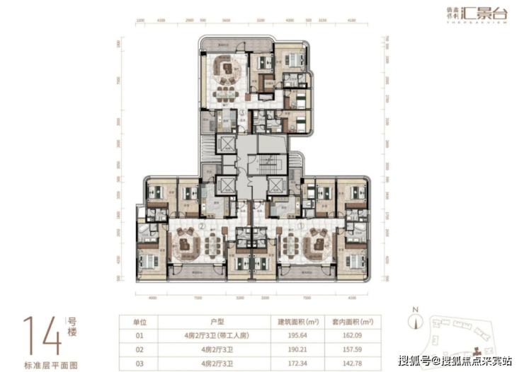 项目由14栋12层小高层组成,产品涵盖123-352㎡三至五房,共8类户型,户型实用率约82-84%。