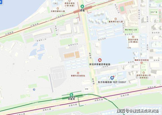 景田南片区丨新世界香蜜四季家园:位于福田区香梅路与新闻路交汇处东北角,距离1号线香蜜湖站约500米。距离市民中心约1.4公里,