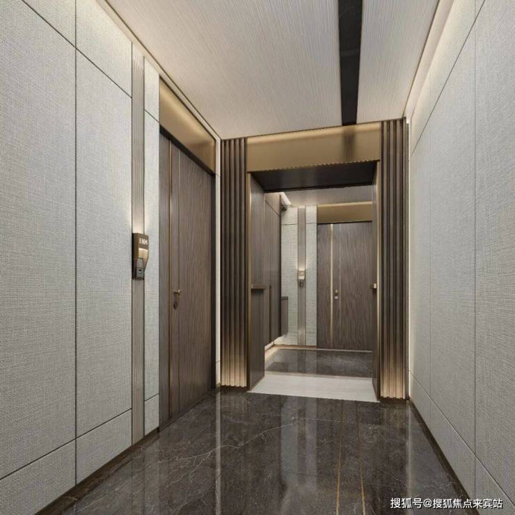 The design language of the standard floor common area is “minimalist order”, with textile wall panels, stone skirting and copper inlays, creating a restrained and gentle transition area. Linear light fixtures and light strips on the flooring form a guiding relationship, reinforcing the rhythm of movement. The dark wood leather entrance door combines with metal door cover and no main light to create a dignified and quiet homecoming ceremony. The aesthetics of the finishes are revealed in the rational order, and the passage space is elevated to a ceremonial and recognizable foyer system.