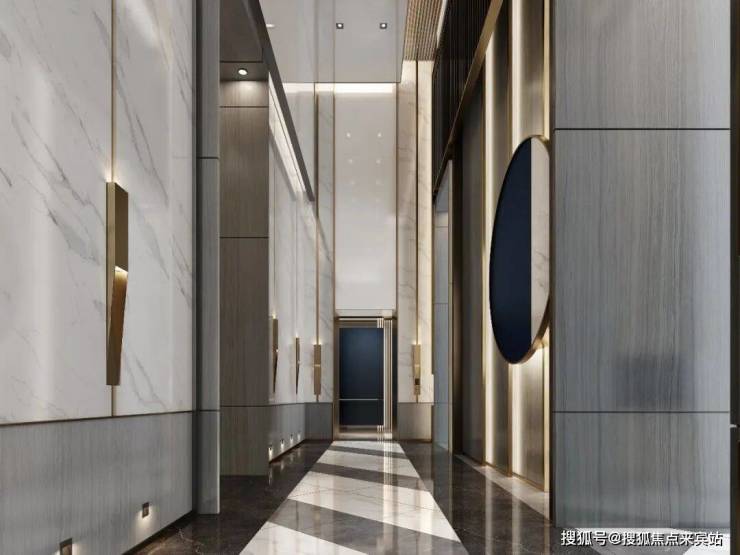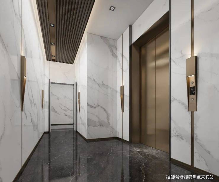 The symmetrical axis strengthens the spatial order, and the rhythmic tension is constructed with dark and light materials. The overall contrast between white stone, dark wood grain and metal outline is exquisite, and the ceiling adopts light curtain panel embedded lights to create a sense of sequence and ceremony. The lighting and wall metal lines echo vertically, releasing the rational aesthetics of the elevator hall as a high-class business venue in the midst of simplicity.