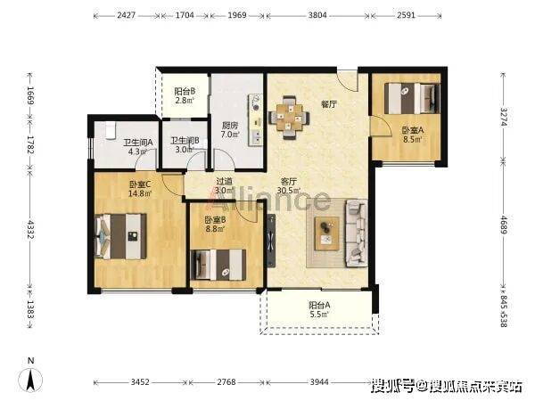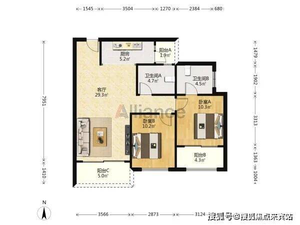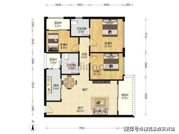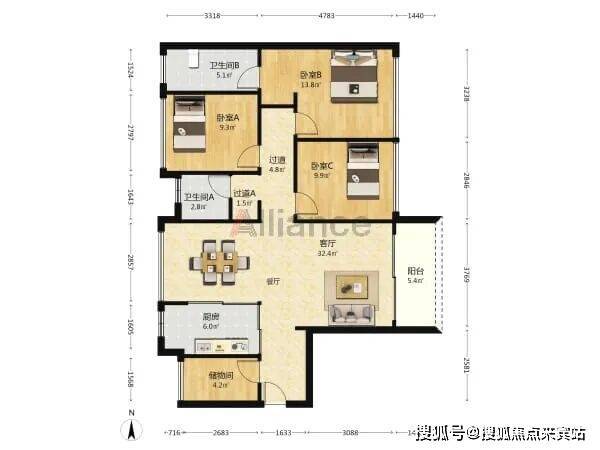 B/C座 A户型:约119㎡3房2厅2卫
