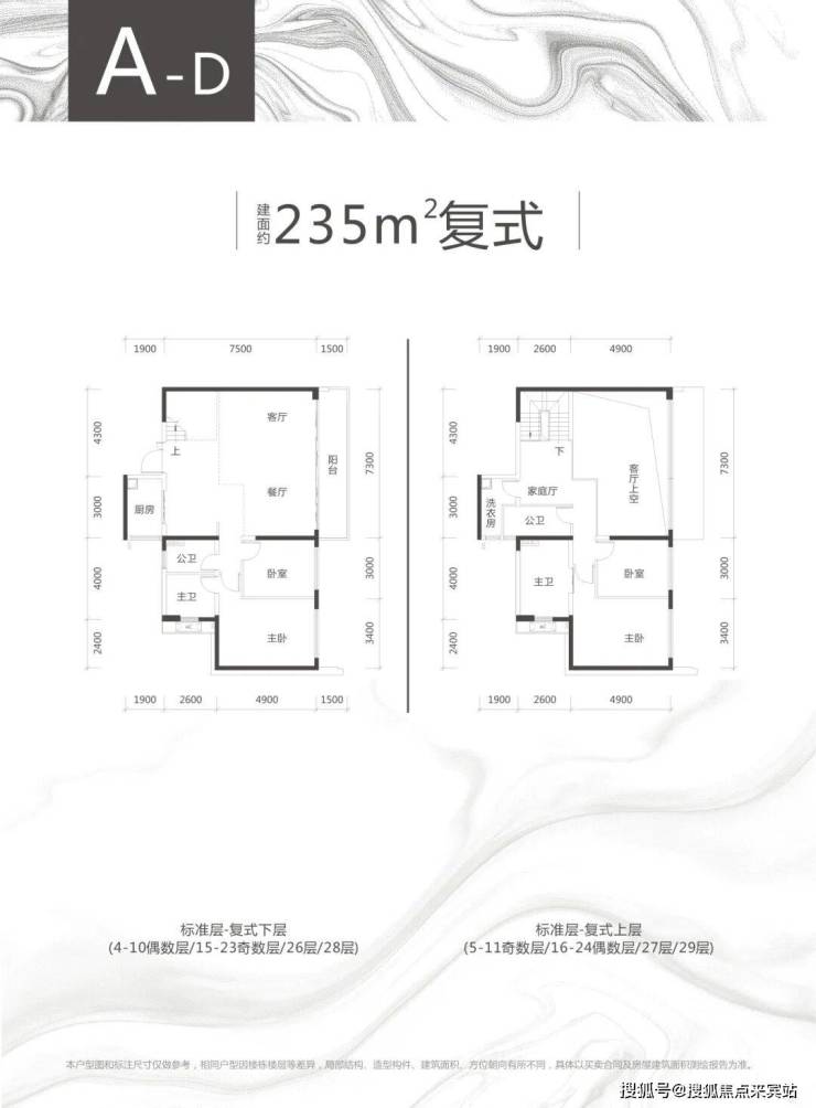 以上两种复式户型格局大体相似,具体面积有些许不同,为东南和西南朝向,4个卫生间配置也算比较奢侈的了。客厅开间达7.3米,出进深1.6米的阳台,视野开拓感还是比较好的。
