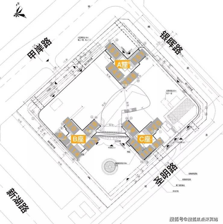 项目三栋住宅均为塔楼设计,A座三梯四户,B座、C座均为三梯五户,各栋户型分布平面图如下: