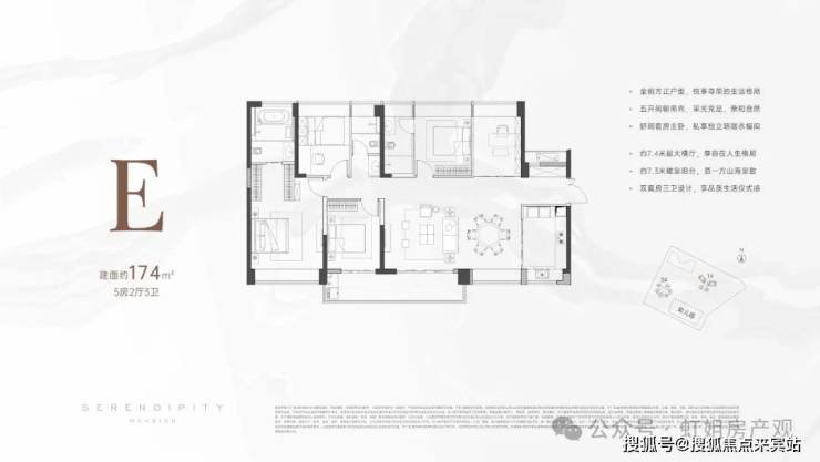 建面约174㎡横厅5房2厅3卫,同样做到五开间朝南向,夏天享清风,冬日晒暖阳。还享有约7.3米超长阳台,搭配约7.4米超大横厅,会客休闲气度十足,观景远眺一览无余。奢侈双主卧套间设计,保障熟人私密性,尊重并平衡两代的生活习性。