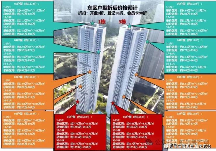 项目共分为两期开发,共4栋可售商品住宅。其中第一期为项目西区,总楼栋为2栋,层高为36-37层,户型朝向以西南/东南为主,容积率为3.45,整体得房率约76%-80%(不算飘窗和阳台一半面积),这些都是市面上稀缺的价值卖点。