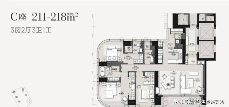 C栋 211-218㎡ 层高3.3 三房,西南、51层,4梯3户,约120余套
