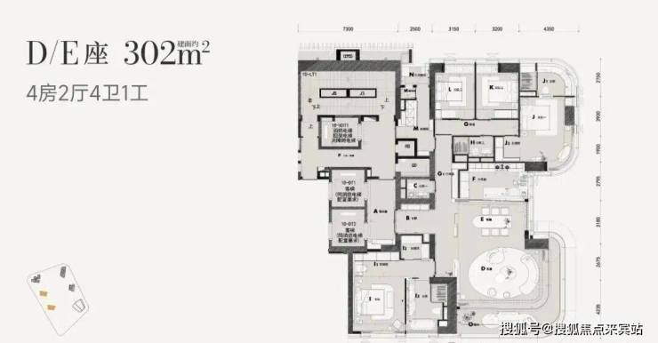 302㎡4房4卫+家政,3T2户,客餐厅约8米进深、7米开间,L型阳台。