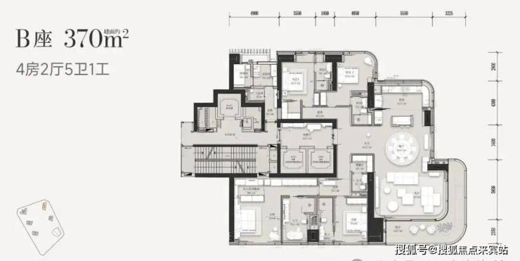 370㎡4房5卫+家政,5T2户,客餐厅约9.2米进深、7米开间,L型阳台。