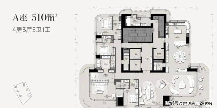 512㎡4+1房2厅5卫+家政,3T1户,客厅约12.5米进深,开间7米,客厅、主卧L型阳台。