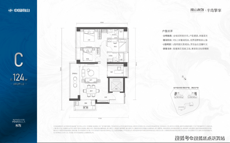 124㎡的4房2厅2卫,1栋01/2栋05户型,电梯入户送独立公区,设计的是横厅南北通透格局,客餐厅6.1米开间,LDKB一体化设计,五开间朝南,主卧大套间设计,6.1米长观景大阳台,U型厨房,公卫三段式分离,得房率:72.07%(不含赠送),西北或东南朝向。