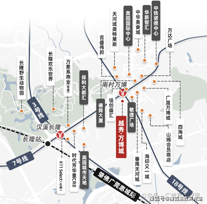 三地铁线、双地铁站的优势,距离地铁7号线和18号线的交汇站点南村万博站仅有约1.3千米,距离地铁7号线与3号线的交汇站点汉溪长隆站仅有约1000米,走路过去也是很便捷的。