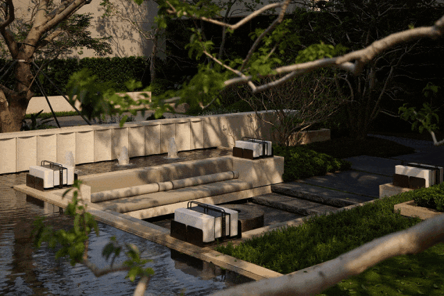 项目共规划约7.2万平超级中央园林,在目前已开放的实景园林里,已经能感受到它想要带给业主的精神气质,是在CBD里,仍保有随时可享的宁静与松弛。当夜幕降临,水景两侧的巴西奢石呈现灯光下跳动的银,与背景叠水流动的光影交织奏鸣。