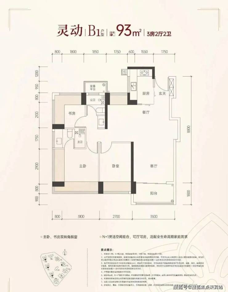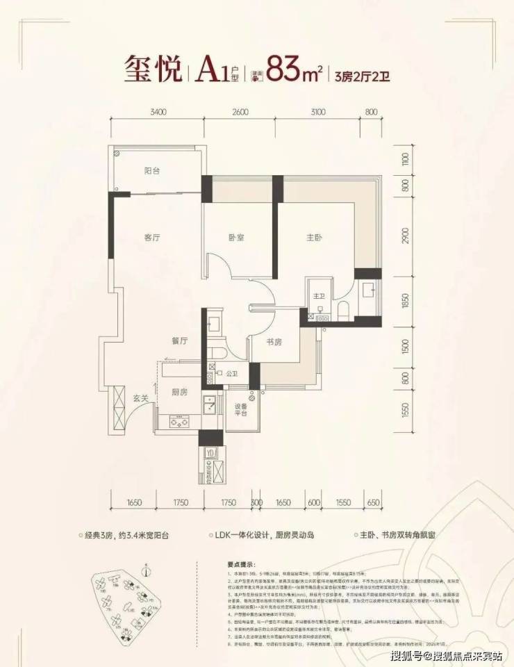 83㎡-3房2厅2卫,设计的是竖厅格局,客厅3.4米开间,LDKB一体化,S墙设计预留冰箱卡槽位,动静分区,主卧270°无柱转角飘窗,分别做到了主卧16.53㎡/次卧9.62㎡/次卧6.63㎡(包含墙体飘窗),U型厨房,公卫三段式干湿分离,还带1个设备平台,得房率约100%(包含赠送),首推的1/2栋东北朝向。赠送面积约13.74㎡。