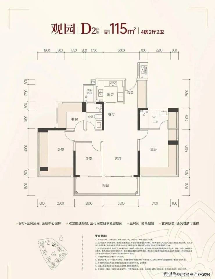 115㎡的4房2厅2卫,设计的是竖厅双龙抱珠格局,客厅3.5米开间,四开间朝南,分别做到了主卧18.33㎡/次卧17.28㎡/次卧10.36㎡/次卧7.41㎡(包含墙体飘窗),U型厨房,卫生间干湿分离,还带1个设备平台,得房率约100%(包含赠送),客厅连接次卧出11.34㎡的大阳台,西南朝向。赠送面积约27.59㎡。