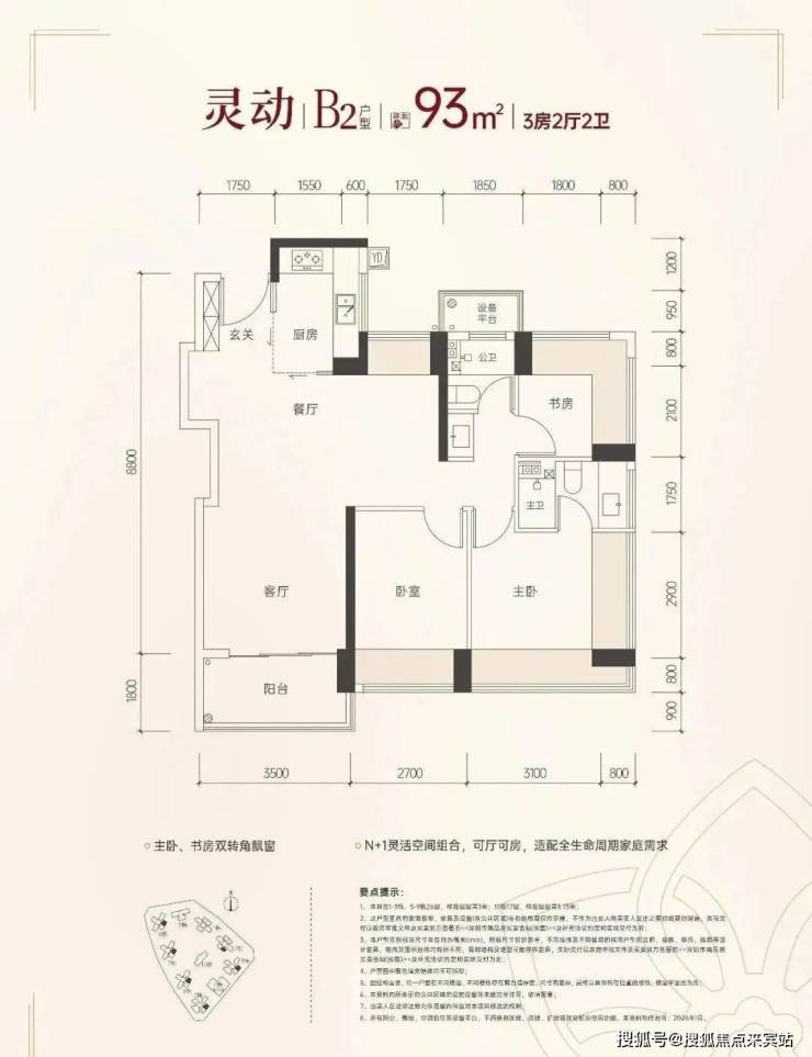 93㎡的4房2厅2卫,设计的是竖厅格局,客厅3.5米开间,LDKB一体化,S墙设计预留冰箱卡槽位,动静分区,三开间朝南,分别做到了主卧15.51㎡/次卧10.53㎡/次卧7.54㎡/次卧6.81㎡(包含墙体飘窗),L型厨房,公卫三段式干湿分离,还带1个设备平台,得房率约100%(包含赠送),首推的1/2栋西南朝向。赠送面积约17.67㎡。