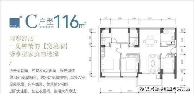 116㎡的4房2厅2卫,C户型,设计的是竖厅南北通透格局,餐客厅一体化设计,客厅3.8米开间,四开间朝南,4个卧室分别做到了主卧17.85㎡/次卧11.4㎡/次卧9.3㎡/次卧8㎡(包含墙体飘窗),都不用搭配飘窗做床,U型厨房,卫生间干湿分离,得房率约:93.13%(包含赠送),阳台主朝西南、东南或正南向。