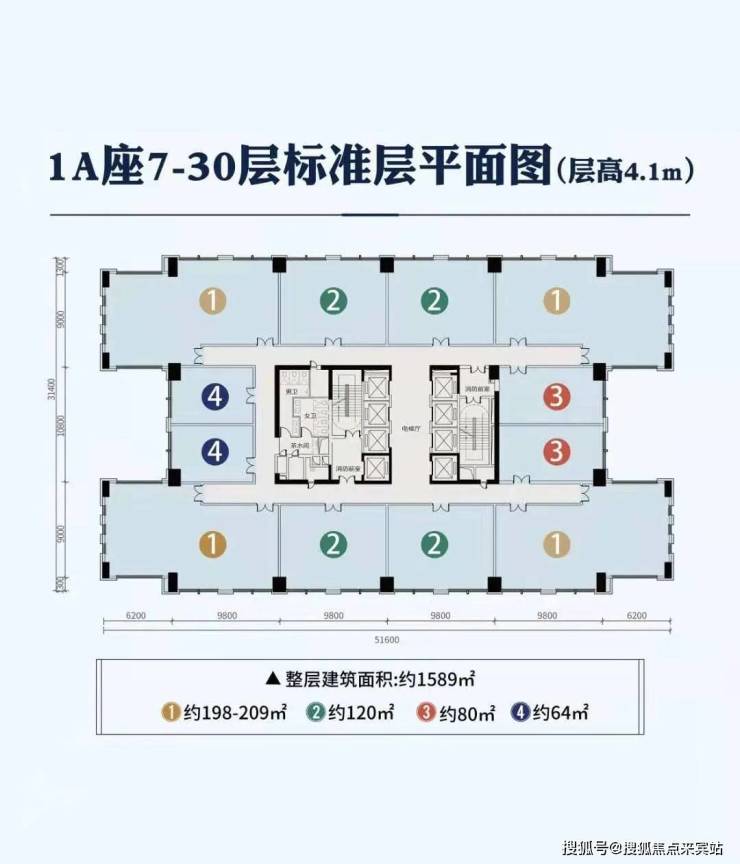 整层面积:塔楼A座1589㎡,商铺65-1087㎡
