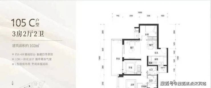 105㎡: 竖厅格局,客厅与卧室连通超大阳台,LDK一体化设计,主卧室270度转角飘窗,看城市景观,主要朝向为西南和东南