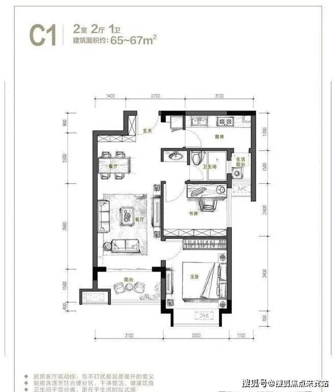 C1户型,建面约65-67㎡2室2厅1卫