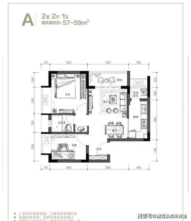 A户型,建面约57-59㎡2室2厅1卫