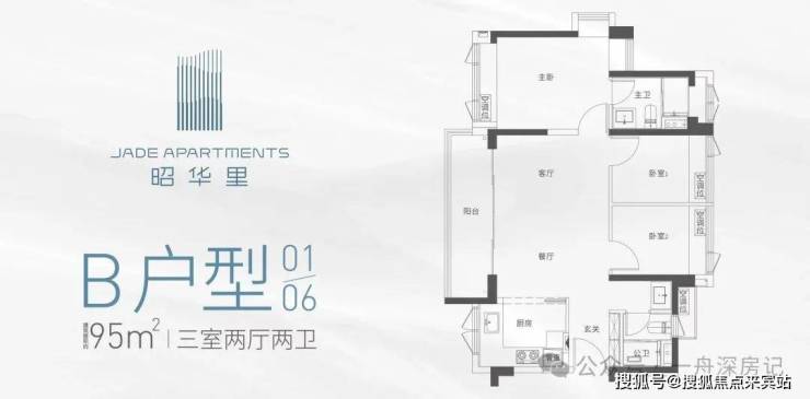 三房两卫的竖厅 95㎡ 户型为三面宽南向,竖厅方正格局。竖厅设计中采用了 LDKB 客厅,使厨房空间可 以双向打开,满足社交型厨房的需求。卧室均采取了满凸窗赠送,使室内有充足的采光与视野。阳台为 5.55m 宽双开间阳台,满足生活起居需求的同时,拓展了南向视野。