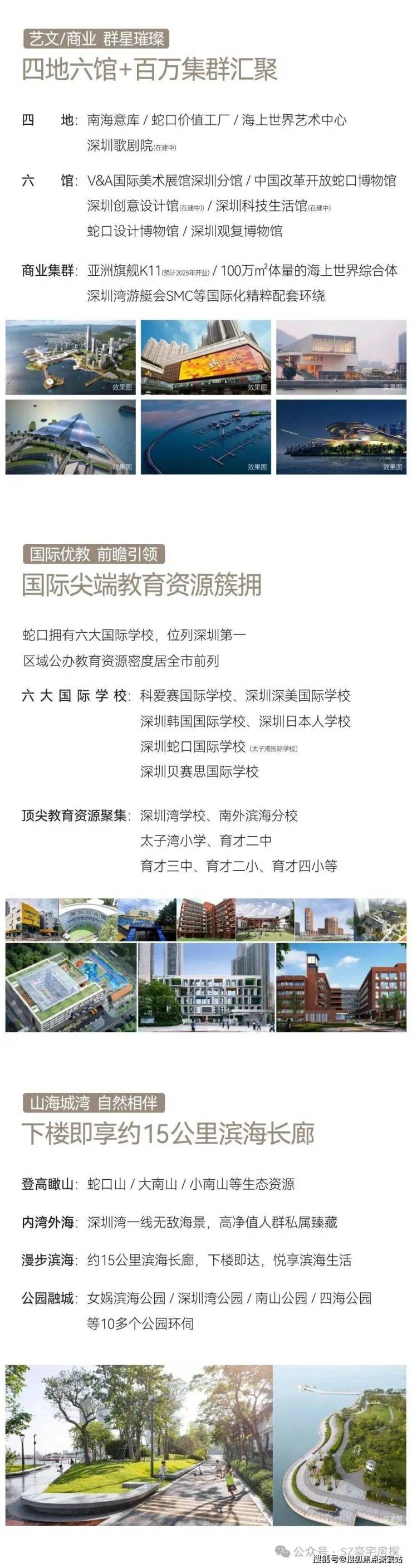 景观环境:项目南、西、北三面环海,拥有 270° 海景视野,周边还有十五公里滨海长廊、蛇口山公园、大小南山公园、四海公园以及深圳湾公园等多个公园环绕。