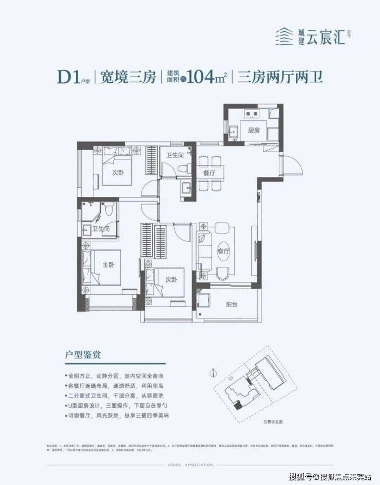 104㎡的3房2厅2卫,设计的竖厅南北通透格局,餐客厅一体化,U型厨房,阳台西南朝向。