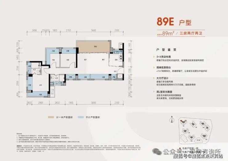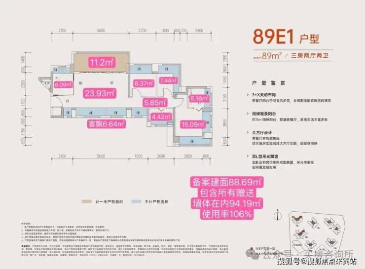 从具体的户型设计来看,居所几乎被飘窗+阳台环绕,据悉赠送率最高可达27%。