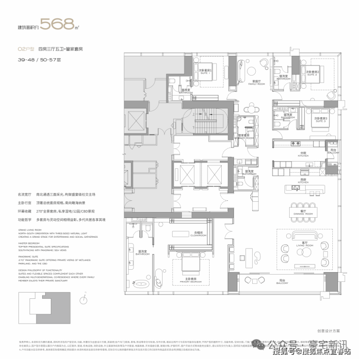 公寓主力户型为303㎡、326㎡、404㎡、572㎡等大平层,最大户型达1000㎡