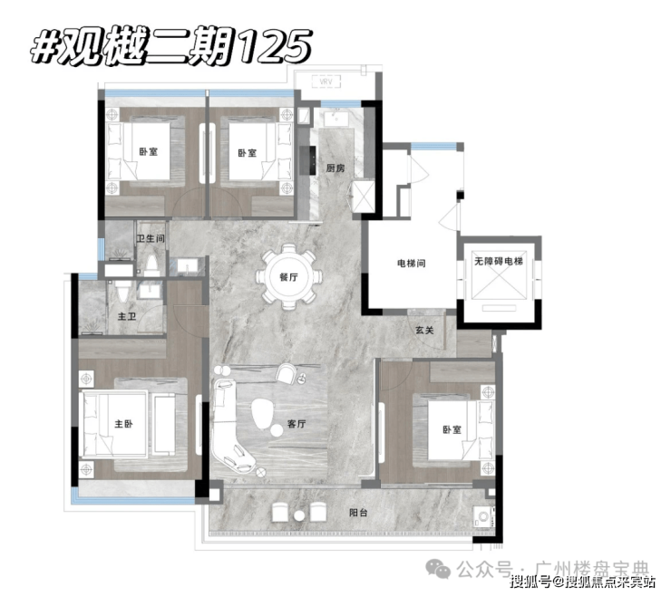 建面125平四房,和一期的140平很像,但是少了一个卫生间,阳台长约8.1米,北向的两个次卧可分可合,南向次卧也可以融入客厅,改造性非常强。越秀观樾售楼处电话☎:400-150-5057