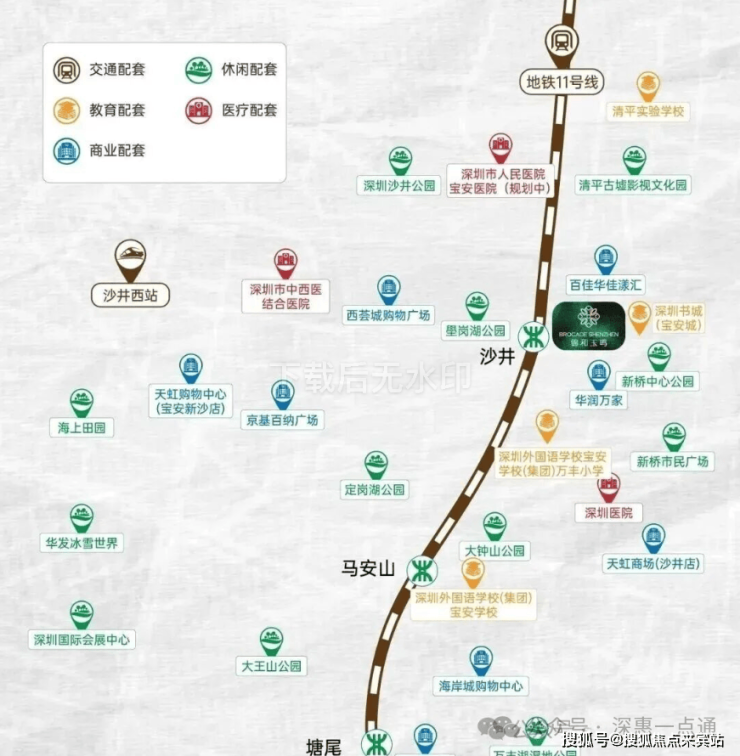 项目还拥有海陆空轨铁六维交通网络,包括广深高速、外环高速等自驾路线。广深高速新桥出口驾车约5分钟可达,外环高速新桥站约10分钟车程,可快速连接福田CBD、宝安机场等核心区域。穗莞深城际沙井西站驾车约10分钟可达,通过公交653路可直达该站,未来穗莞深城际机前段工程建成后,从沙井西站至前海核心区仅需15分钟,实现与广州、东莞的快速连接。