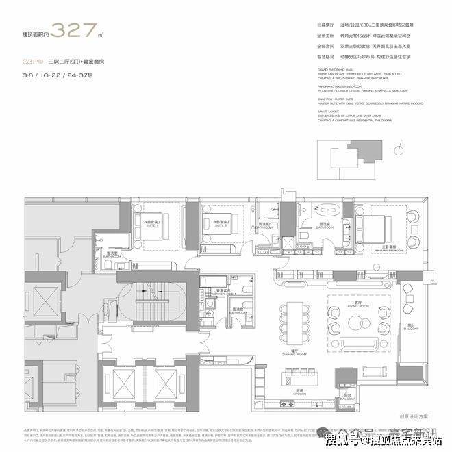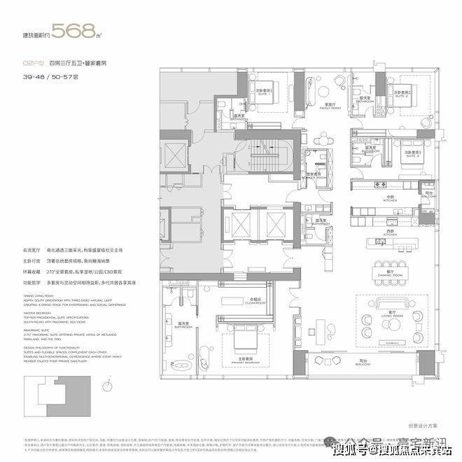项目用地面积9.24万㎡、土地性质为商业、容积率3.0、计容建面27.7万㎡,建筑高度228米,层高3.6米,户型有304㎡、327㎡、402㎡、568㎡和1000㎡,小户型分布在中低区(3∽37楼),大户型分布在高区(39∽57楼)。