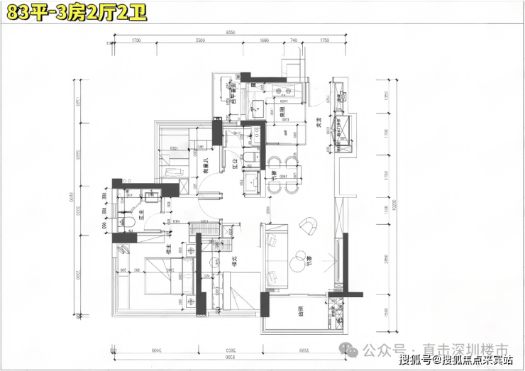 83㎡的3房2厅2卫,设计的是经典竖厅格局,客厅3.35米开间,LDKB一体化,S墙设计预留双开门冰箱卡槽位,三开间朝南,动静分区,分别做到了主卧16.02㎡/次卧9.08㎡/次卧7.01㎡(包含墙体飘窗),U型厨房,公卫三段式干湿分离,赠送1.98平设备平台,得房率约77.15%(不含赠送),阳台5.02m²西南或东南朝向。靓点:83平做到了3房2卫,主卧270°无柱转角飘窗,厨房烟道外置+额外赠送设备平台,并且是纯南向格局。