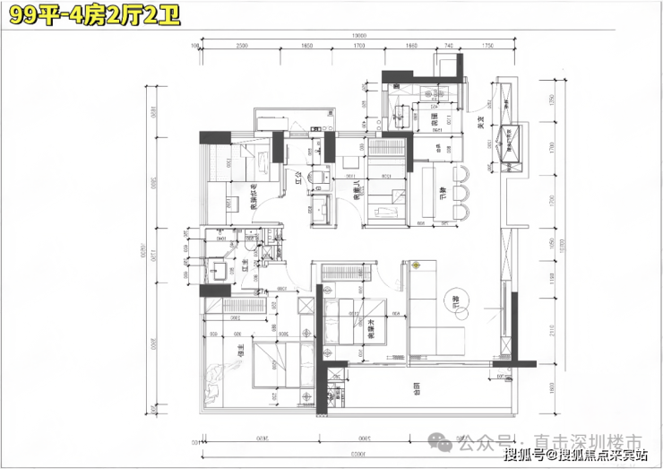 99㎡的4房2厅2卫,设计的是竖厅格局,客厅3.35米开间,LDKB一体化,S墙设计预留双开门冰箱卡槽位,三开间朝南,动静分区,分别做到了主卧15.26㎡/次卧9.57㎡/次卧6.96m²/次卧6.96㎡(包含墙体飘窗),U型厨房,公卫三段式干湿分离,赠送设备平台,得房率约78.27%(不含赠送),客厅连接次卧出9.37m²大阳台西南或东南朝向。靓点:99平做到了4房2卫,主卧270°无柱转角飘窗,厨房烟道外置+额外赠送设备平台,并且是纯南向格局。