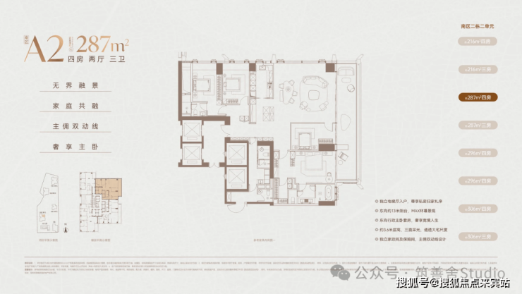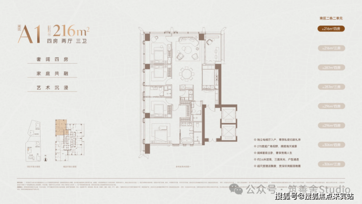 216㎡四房两厅三卫:入门顶豪,四房功能齐全,无保姆间,适合精英家庭;客厅 + 东向大阳台联动,阳台进深约 2.4 米;92%+ 实用率,框架核心筒无次梁,可微调布局。