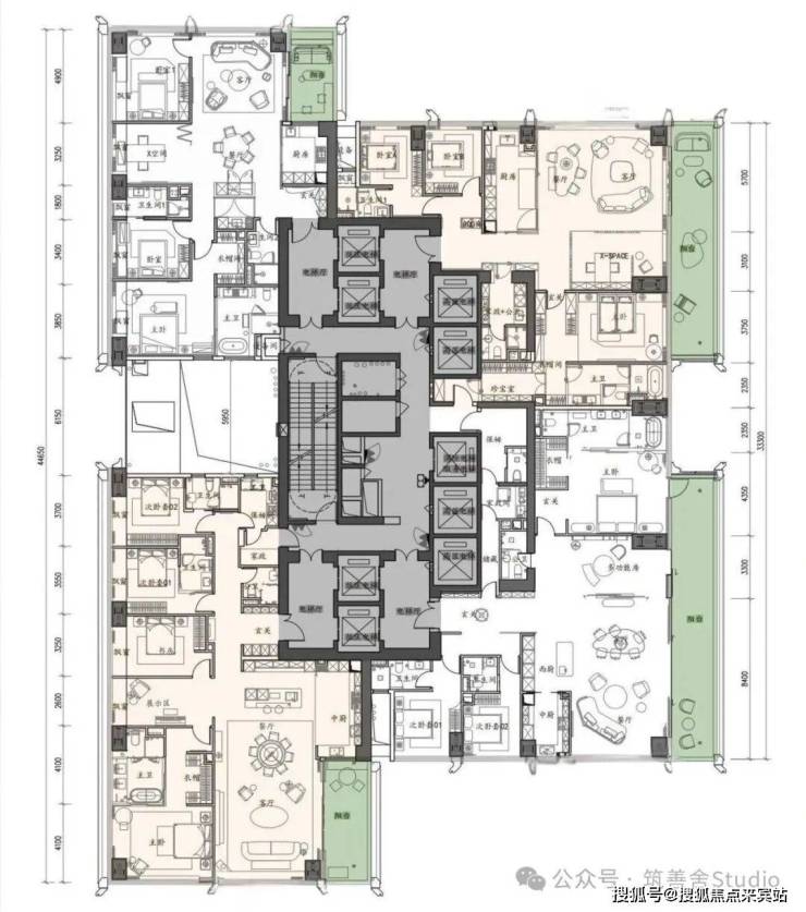 主力370–375㎡与403㎡:标配独立家庭厅 + 完整家政套间 + 保姆梯;西南 / 东南双面采光,270° 转角视野;厨房分中厨(专业封闭)+ 西厨(社交开放),可选嘉格纳 / 方太双厨电品牌;部分户型带 X 可变空间,可做茶室 / 书房 / 收藏室。