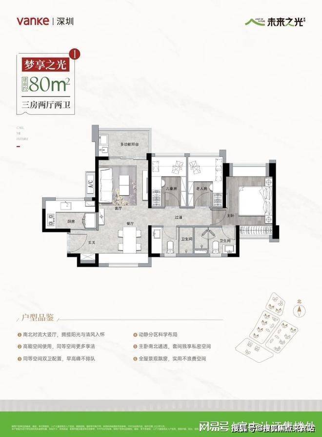 80㎡的3房2厅1卫,01.02/05/06户型,设计的是竖厅格局,进门入户玄关,LDKB一体化,S墙设计预留卡槽冰箱位,四开间朝南,U型厨房,卫生间干湿分离,得房率80.69%(不含赠送),西南或东南朝向。