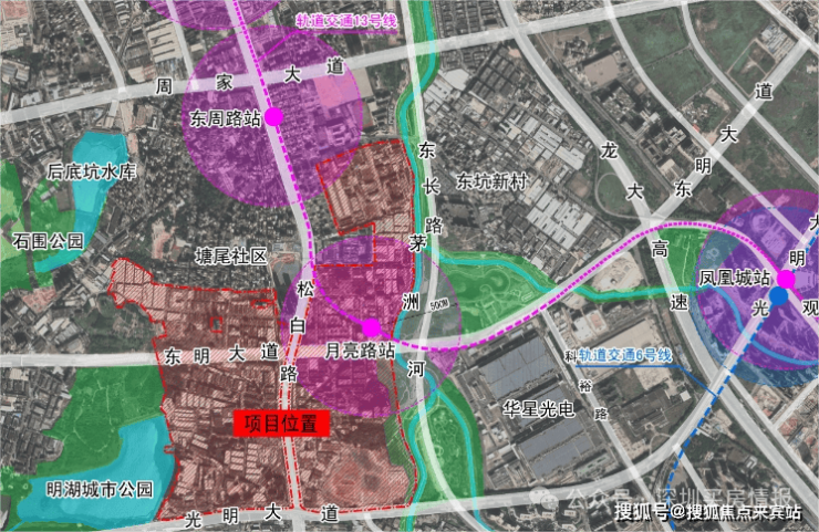片区更新单元有轨道快线13号线(在建)穿过,是13号线(在建)月亮路站的TOD大城。从月亮路站出发,1站即达凤凰城站,在此处换乘6号线,可便捷通达福田中心;3站即到轨道枢纽光明城站,搭乘高铁,可快速直达深圳北、福田。